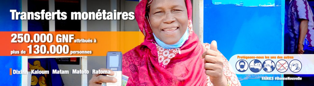 Depuis le mois d’août 2020, le Gouvernement guinéen, à travers l’ANIES, opère des transferts monétaires en faveur des couches les plus vulnérables dans la zone spéciale de Conakry. Ces opérations s’inscrivent dans le cadre de la riposte gouvernementale à la pandémie de la Covid-19.